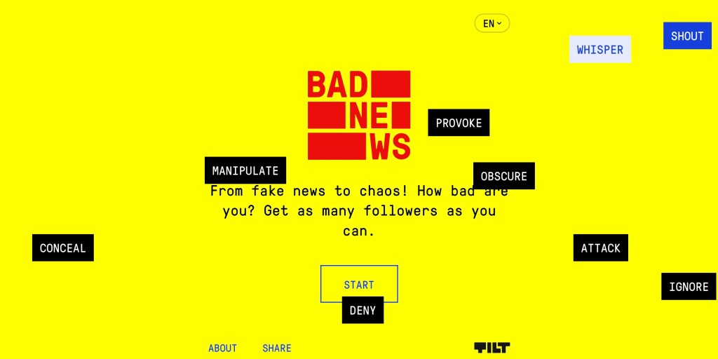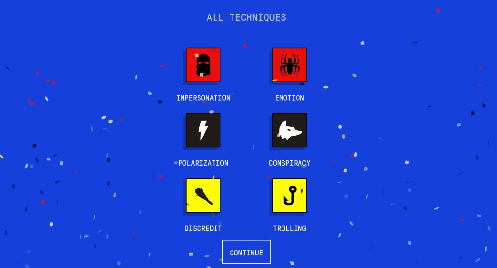 Another tool that can be used to help people discern misinformation and how it works are interactive games. These programs are more used as educational tools rather than an actual video game that is played for fun. The game that I happened to select was Bad News which was based on creating misinformation and disinformation for a higher score. This game was really helpful when it comes to viewing disinformation is created from the perspective of the person creating that type of news. The game follows your progression towards understanding impersonation, emotional manipulation, polarization, conspiracy, discrediting, and trolling. You learn these concepts as the game progresses through interactive decision making based on making the most deceitful content imaginable. You become more polarizing as the game progresses in order to gain the most amount of influence and followers you can. You are allowed to choose the types of content presented and it depicts your followers reactions after you make a decision. This represents real scenarios and behaviors that these types of individuals engage in. For example, in order to maintain credibility you have to attack outlets that are calling you out on your misinformation. You also engage in deception with purchasing bot accounts to spread your message along. There really are no rules when it comes to the spread of disinformation.